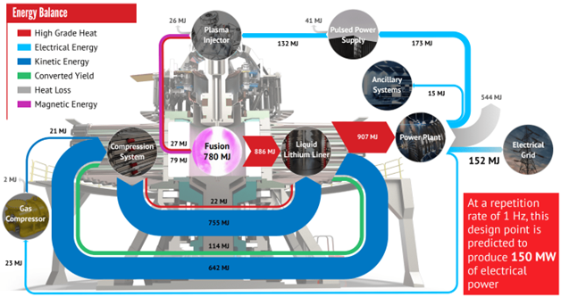 The technology is designed to scale for cost-efficient power plants. It uses mechanical compression to create fusion conditions in short pulses, eliminating the need for expensive lasers or superconducting magnets. An MTF power plant is designed to produce its own fuel and inherently includes a method to extract the energy and put it to work.