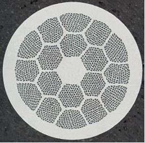 A cross-section of Bismuth-2212 superconducting wire. The dark dots are the filaments that carry current with zero resistance.
