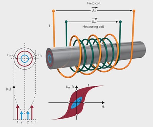 In the reception winding of the measuring coil, a voltage is generated depending on the conductivity of the tested material (electric parameter) as well as on the shape and size of the hysteresis curve (magnetic parameter). The evaluation of this voltage allows the testing of ferromagnetic and austenitic steels as well as non-ferric metals.