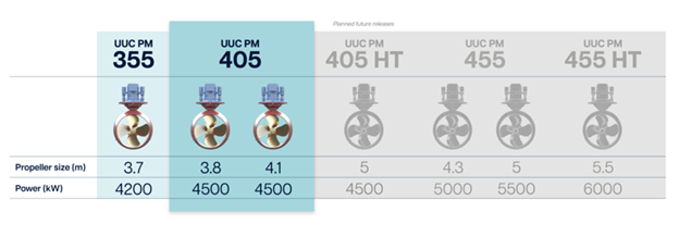 In December, it introduced two new sizes to its UUC PM 405 model include units with 3.8m and 4.1m propeller diameters, delivering 86 and 91 metric tons of thrust respectively. Its engineers are working on future models offering up to 5.5m diameter and power ratings of 6000 kW, following a product development roadmap that supports the company’s ambition to support larger vessels and more demanding applications for the evolving offshore energy sector.