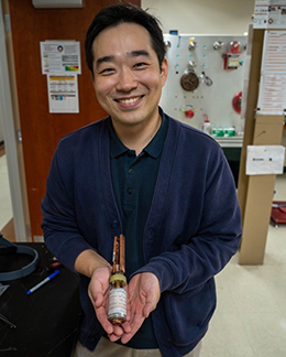 Applied Superconductivity Center researcher Jeseok Bang with the prototype “Little Big Coil” magnet that reached a record 48.7 tesla.