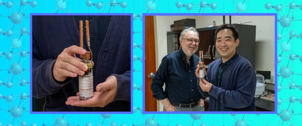 MagLab Chief Materials Scientist David Larbalestier and researcher Jeseok Bang (holding coil).
