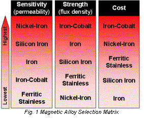 The most important magnetic criteria to consider, however, are the relative performance characteristics known as sensitivity (permeability) and strength (flux density), along with the respective cost of the alloys considered. In Fig. 1, a matrix that compares these key values can serve as an initial guide for the designer in selecting which groups of alloys to explore for a specific application. The groups include currently available nickel-iron alloys, silicon iron alloys, iron-base alloys, iron-cobalt alloys, and ferritic stainless steels.