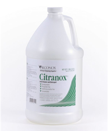 Generally speaking, you want 2% Citranox® Liquid Acid Cleaner and Detergent in a short cleaning cycle at room temperature or only slightly elevated temperature. This will help prevent oxidation. Follow this with an immediate rinse in RO water, as it is less acidic than DI water (due to carbon dioxide absorption from the air).