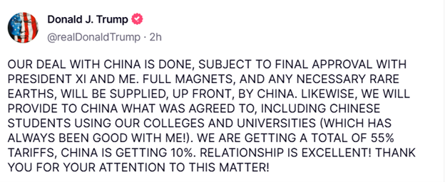 June 11, 2025 – U.S. President Donald Trump announced today that the U.S. and China have negotiated a deal under which China will supply magnets and rare earth minerals, while American colleges and universities will once again admit Chinese students. The announcement came through as a tweet on social media network Truth Social.